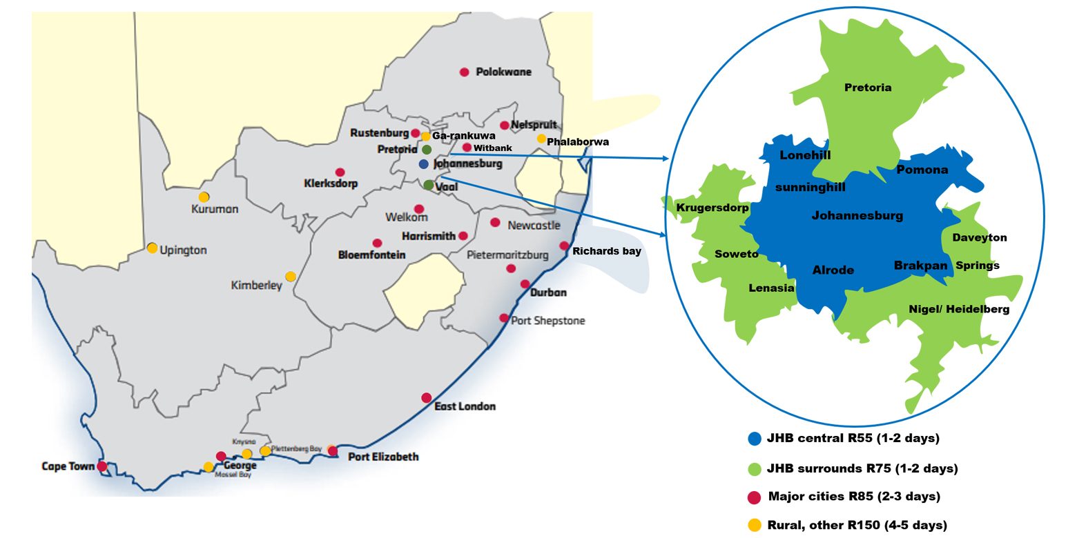 4. Rural and other areas: R150 (4-5 days)