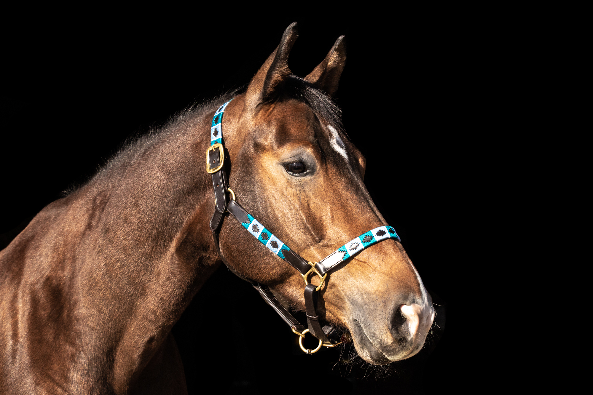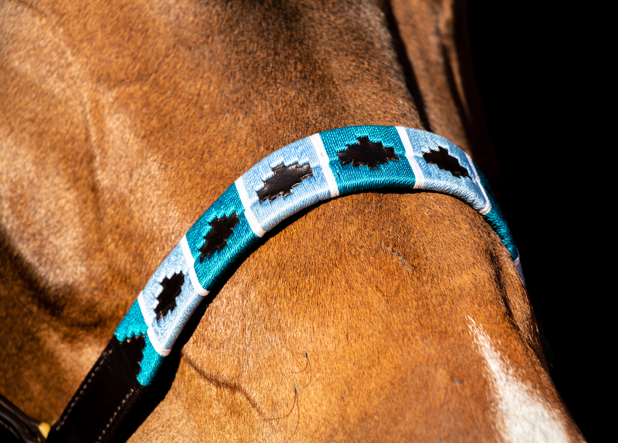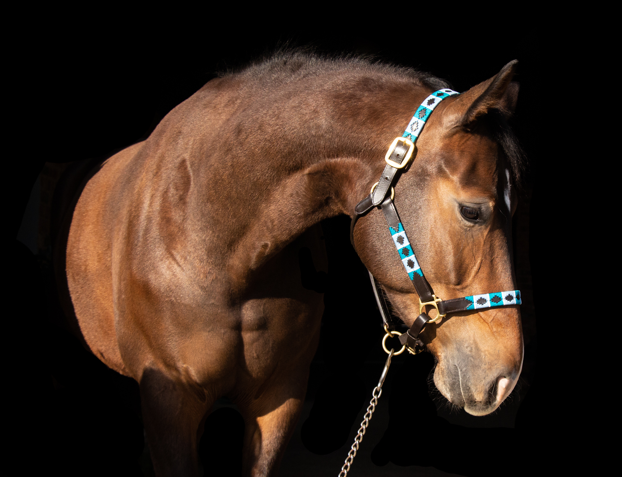 The Turquoise and Blue threaded Polo halter is beautiful on any horse, but looks exceptional on dark bay / black and grey horses!